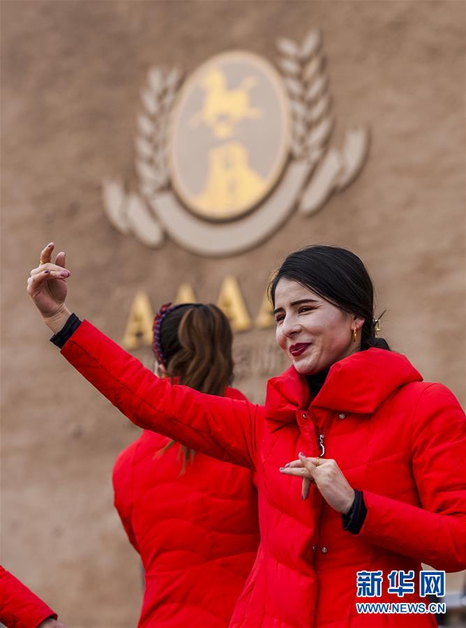 在新疆喀什古城景区的开城仪式上,工作人员跳起舞蹈欢迎游客(2月16日摄)。 新华社记者 赵戈 摄