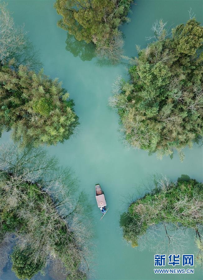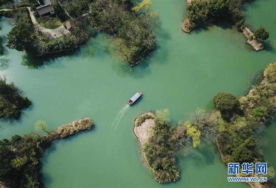 3月15日,游客乘坐游船在西溪湿地观光(无人机拍摄)。 新华社记者 翁忻旸 摄