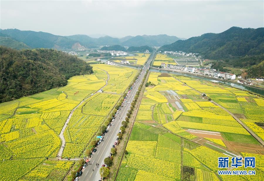 3月23日,东白湖镇金灿灿的油菜花田(无人机拍摄)。 随着气温回升,浙江省诸暨市东白湖镇油菜花盛开,吸引大批游客前来观赏。东白湖镇自2010年起开始建设油菜花景观工程,目前全镇油菜的种植面积近万亩,花期每年接待游客30余万人次,成为当地乡村旅游的一张金名片。 新华社记者翁忻旸摄