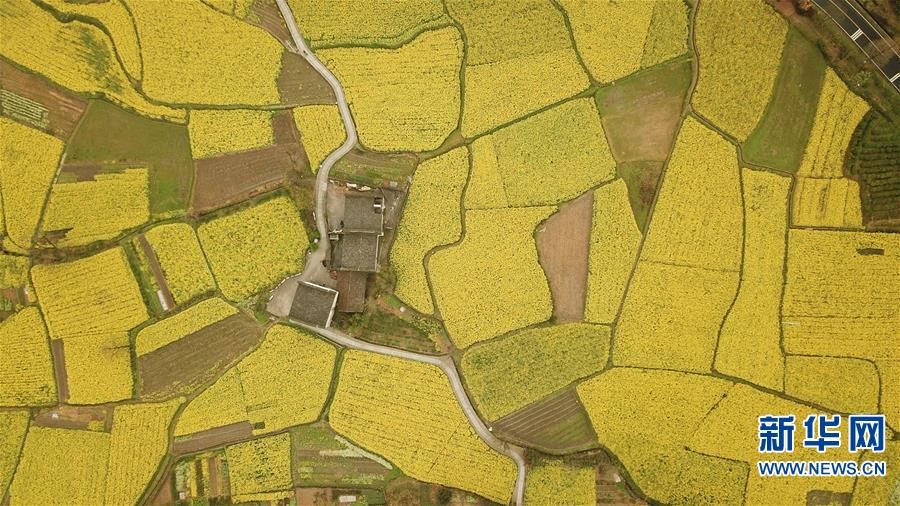 这是黟县卢村的油菜花田(3月28日无人机拍摄)。 近日,安徽省黄山市黟县的油菜花迎来盛花期。金黄的油菜花与屋舍、道路等形成一幅幅美丽的乡村画卷,引人入胜。 新华社记者张端摄