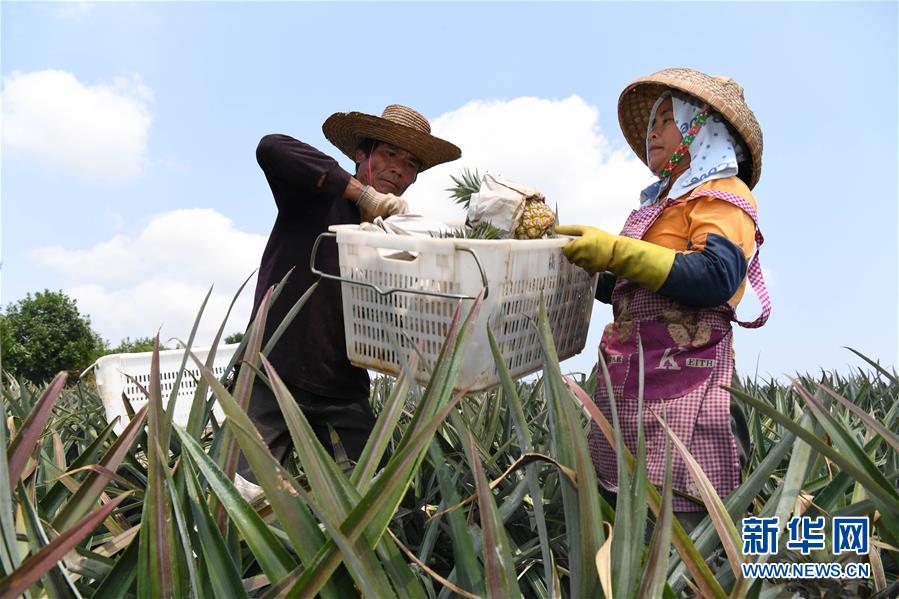 3月28日,广东农垦徐闻红星农场职工在田间采摘菠萝。 近日,广东省湛江市徐闻县的菠萝种植农场迎来今年的首批采摘。徐闻县是菠萝生产大县,种植面积约30万亩,被称为“菠萝的海”。 新华社记者 邓华 摄