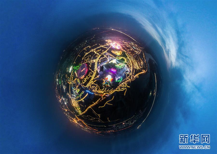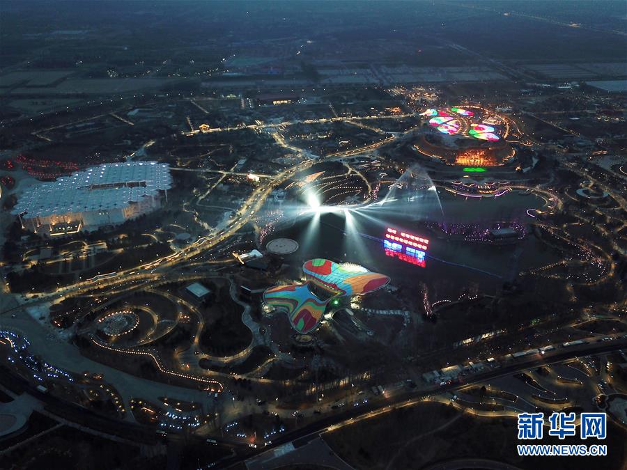 这是3月26日拍摄的北京世园会园区夜景(无人机拍摄)。 截至3月28日,北京世园会园区建设工作已进入冲刺阶段,园区基本成形,公共区域主要建筑全面完工,室内布展正在进行中。 新华社记者 鞠焕宗 摄
