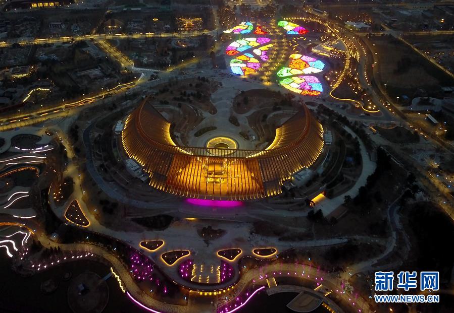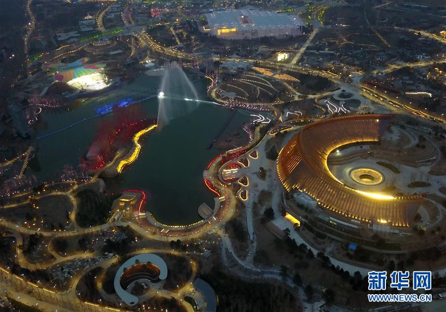 这是3月26日无人机拍摄的北京世园会园区夜景。 截至3月28日,北京世园会园区建设工作已进入冲刺阶段,园区基本成形,公共区域主要建筑全面完工,室内布展正在进行中。 新华社记者 张晨霖 摄