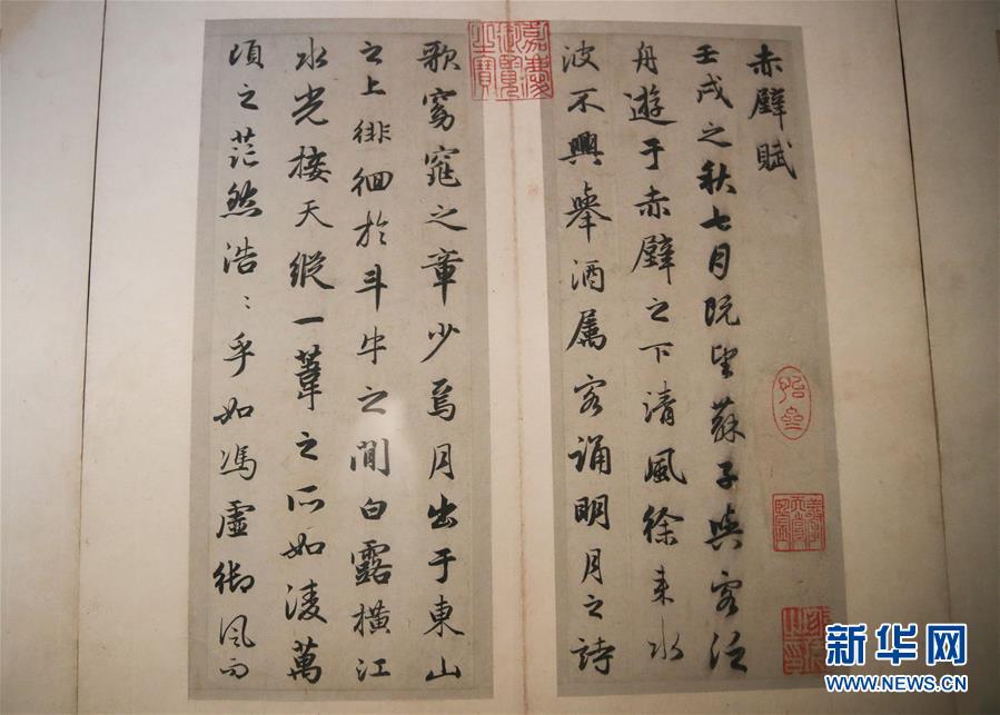 这是3月31日在澳大利亚悉尼举办的台北故宫博物院珍宝展上拍摄的元代赵孟頫行书《赤壁二赋》。一场主题为“天地人”的台北故宫博物院珍宝展正在澳大利亚悉尼展出,这也是台北故宫博物院的珍藏首次在南半球展出。新华社记者 白雪飞 摄