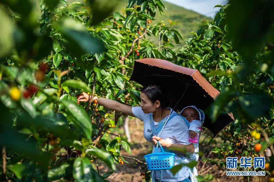 4月20日,游客在樱桃园内采摘樱桃。 当日,画廊六枝·樱桃嘉年华活动在贵州省六盘水市六枝特区落别布依族彝族乡拉开帷幕,期间将举行樱桃采摘游、樱桃展销会等多项活动。 新华社记者 陶亮 摄