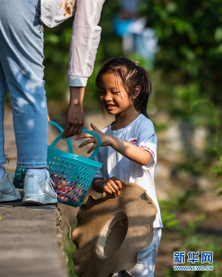 4月20日,小朋友将摘好的樱桃放入提篮。 当日,画廊六枝·樱桃嘉年华活动在贵州省六盘水市六枝特区落别布依族彝族乡拉开帷幕,期间将举行樱桃采摘游、樱桃展销会等多项活动。 新华社记者 陶亮 摄