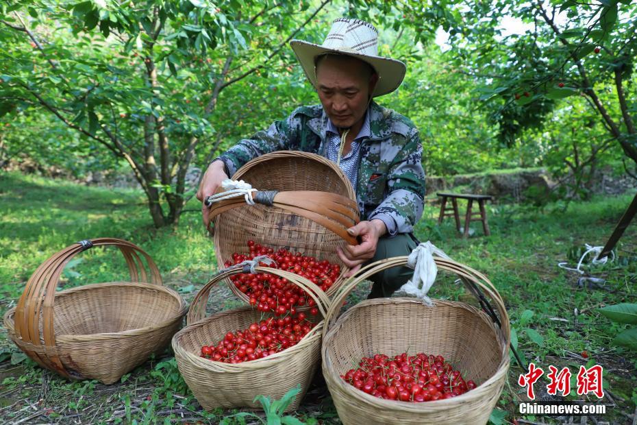 4月24日,果农在贵州织金官寨乡麻窝村樱桃果园采摘樱桃。近日,贵州省毕节市织金县樱桃进入采摘上市期。中新社记者 瞿宏伦 摄