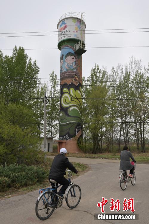 4月28日,北京世园会开幕在即,北京延庆街头世园会气氛渐浓。图为两名民众骑车经过一座世园会涂装的水塔。中新社记者 崔楠 摄