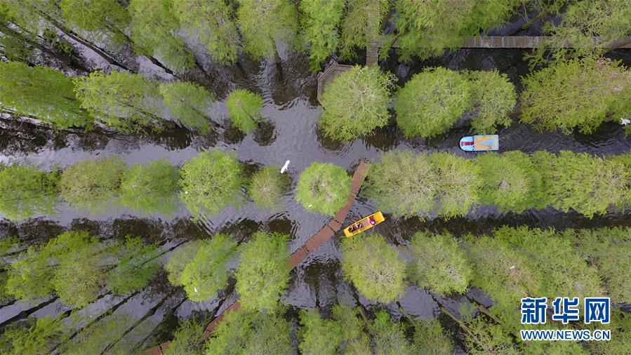 5月2日,游人在江苏省扬州市渌洋湖湿地公园中游览(无人机拍摄)。 “五一”小长假期间,各地人们以不同方式放松心情、欢度假日。 新华社发(孟德龙 摄)