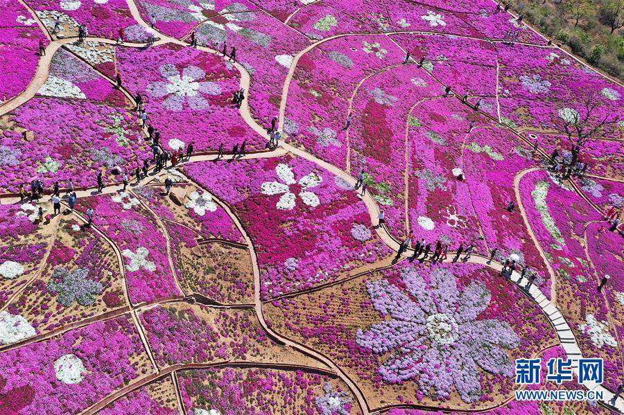 5月2日,游人在河北省唐山市迁西县雨花谷景区赏花游览(无人机拍摄)。 “五一”小长假期间,各地人们以不同方式放松心情、欢度假日。 新华社发(王爱军 摄)
