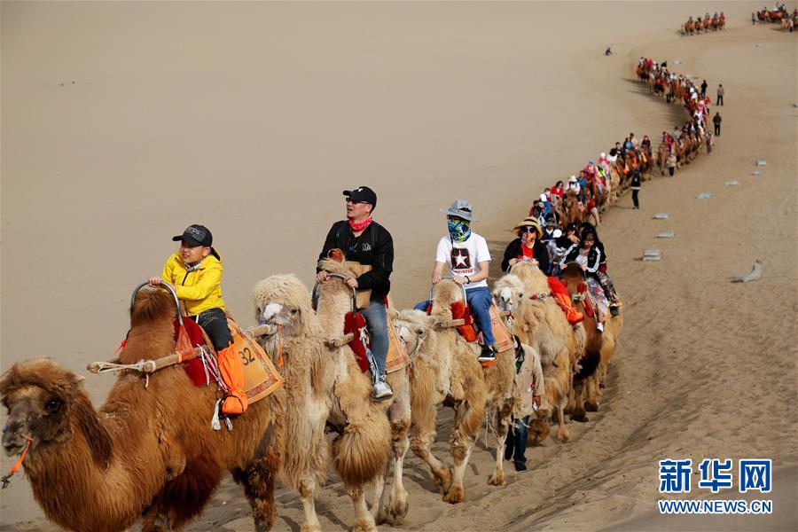 5月2日,游人在甘肃省敦煌市鸣沙山月牙泉景区游览。 “五一”小长假期间,各地人们以不同方式放松心情、欢度假日。 新华社发(张晓亮 摄)