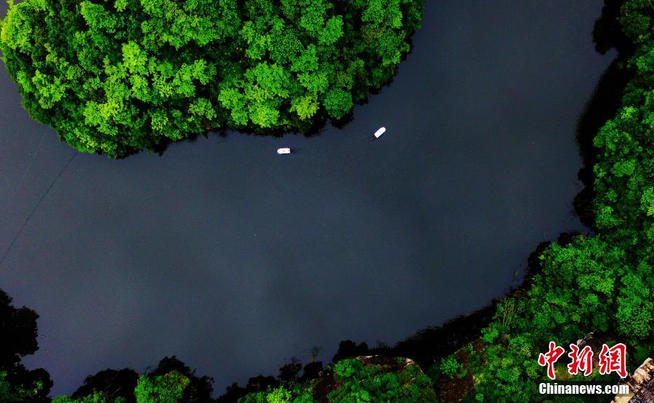 游船行驶在山间碧波荡漾的九镜湖之上,如诗如画。 刘占昆 摄