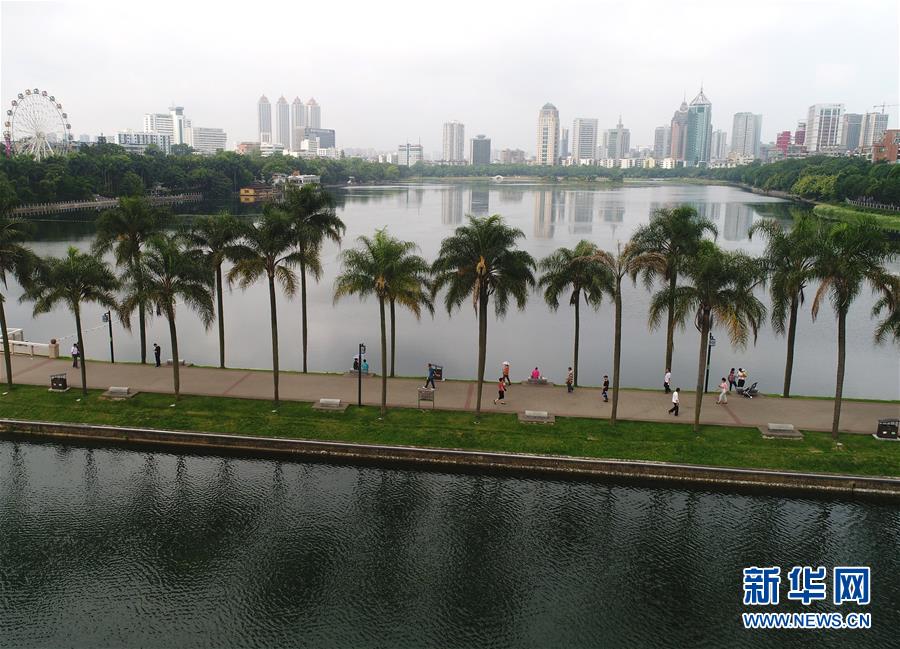 5月15日,市民在广西南宁市南湖公园休闲观光(无人机拍摄)。 广西南宁市从2017年底启动南湖水质改善项目。经过一年多的建设,已形成水面人工岛花香四溢、水下水草依依的生态净化系统。加之步道、凉亭、长廊等配套工程的建设,南湖成为广大市民休闲观光和锻炼的重要场所。 新华社记者 周华 摄