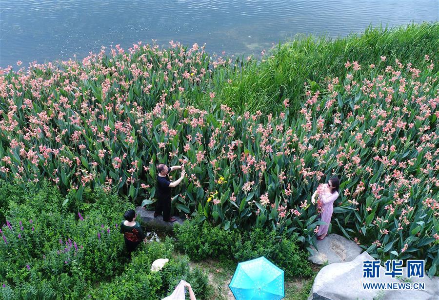 5月15日,市民在广西南宁市南湖沿岸留影(无人机拍摄)。 广西南宁市从2017年底启动南湖水质改善项目。经过一年多的建设,已形成水面人工岛花香四溢、水下水草依依的生态净化系统。加之步道、凉亭、长廊等配套工程的建设,南湖成为广大市民休闲观光和锻炼的重要场所。 新华社记者 周华 摄