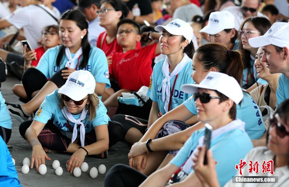 6月7日,为期三天的“水岸台北2019端午嘉年华”在大佳河滨公园开幕。图为参加台北国际龙舟锦标赛的队员,在现场一同体验端午民俗活动“立蛋”的欢乐。中新社记者 刘舒凌 摄