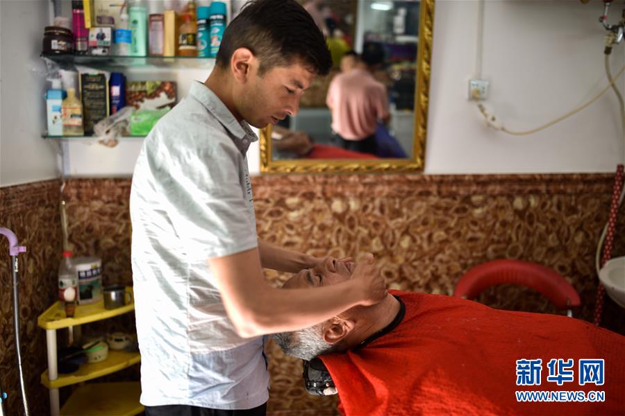 6月12日,在喀什古城景区,当地居民在理发铺里享受“刮脸”服务。入夏时节,新疆喀什迎来旅游旺季,各地游客纷至沓来,在喀什古城景区感受“丝路明珠”的历史文化和民俗风情。据介绍,为了迎接今年的旅游旺季,喀什古城景区通过完善景观和基础服务设施、提升讲解员业务能力和服务水平、开展杂技表演活动等方式,为游客提供更加优质的旅游服务。新华社记者 赵戈 摄