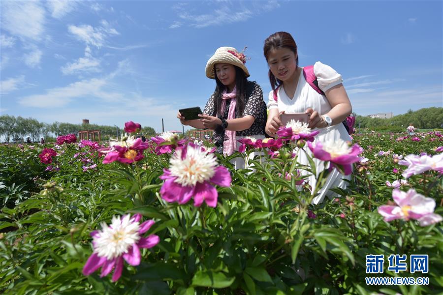 参观者在黑龙江农业经济职业学院校园内欣赏和拍摄芍药(6月19日摄)。 近日,位于黑龙江省牡丹江市的黑龙江农业经济职业学院校园内约7000株成年芍药陆续开放,吸引市民游客前来欣赏。 新华社发(张春祥 摄)