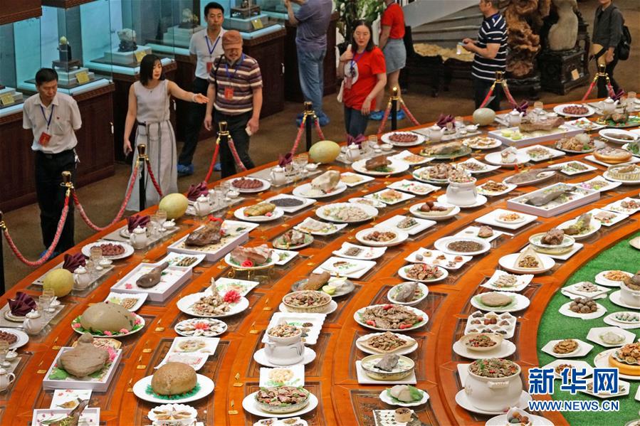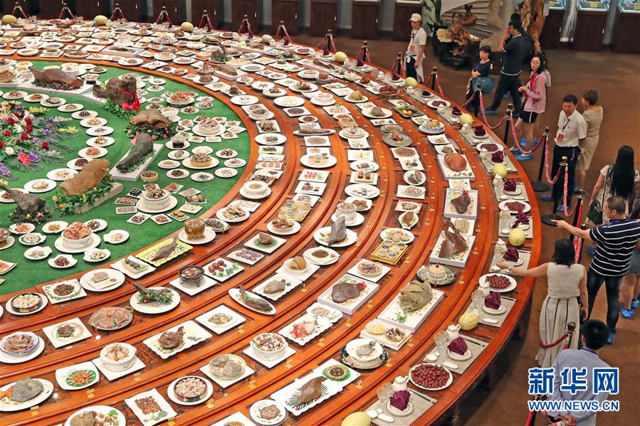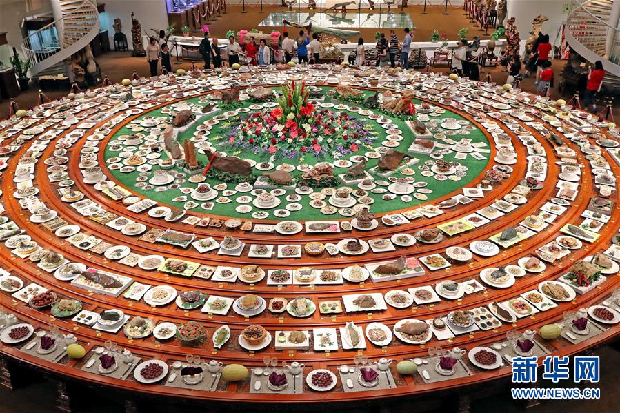 6月28日,游客在参观“奇石宴”。 新疆哈密赏石文化博物馆里这桌由象形石组成的“奇石宴”,由1088道“特色菜品”组成,“宴席桌”直径16.8米,占地面积200多平方米,吸引了众多游客的目光。 新华社发(蔡增乐 摄)