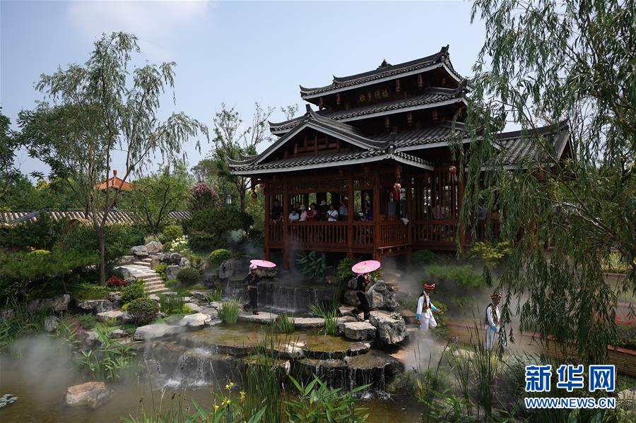 7月18日,游客在北京世园会广西园内参观。新华社记者 鞠焕宗 摄
