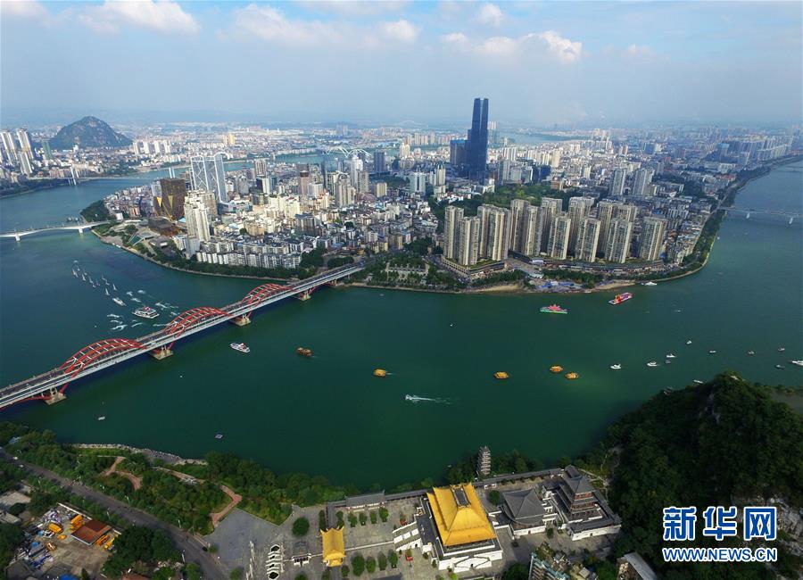 水上巡游编队在广西柳州市柳江上进行狂欢巡游(2016年10月1日无人机拍摄)。新华社记者 李斌 摄