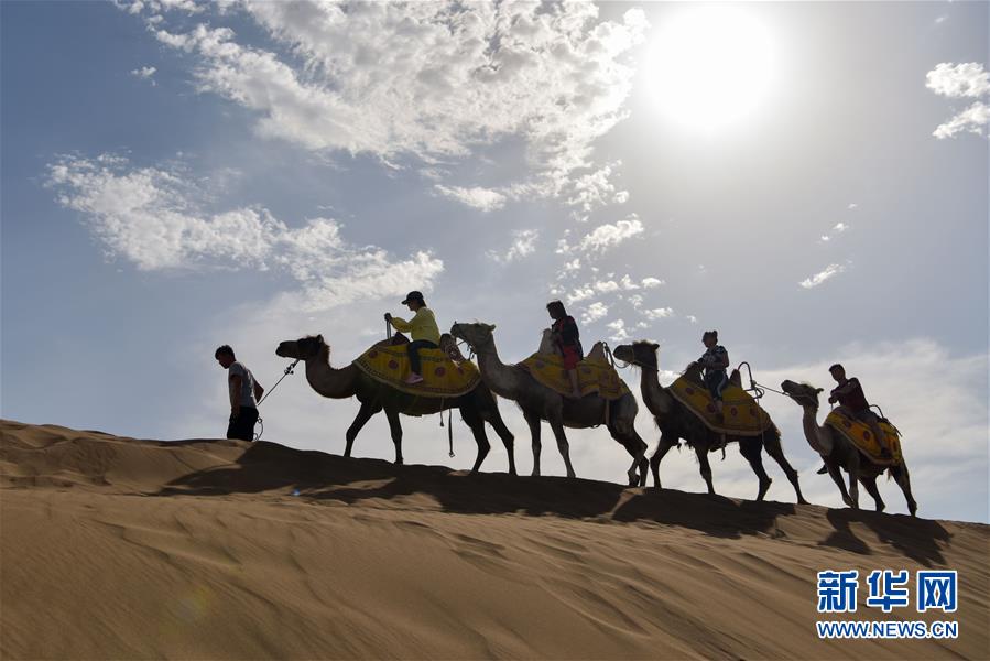 游客在新疆鄯善县库木塔格沙漠风景区体验骑骆驼(7月2日摄)。 炎炎夏日,天南海北的游客来到新疆,寻觅自然美景、感受人文风情。 新华社记者 丁磊 摄