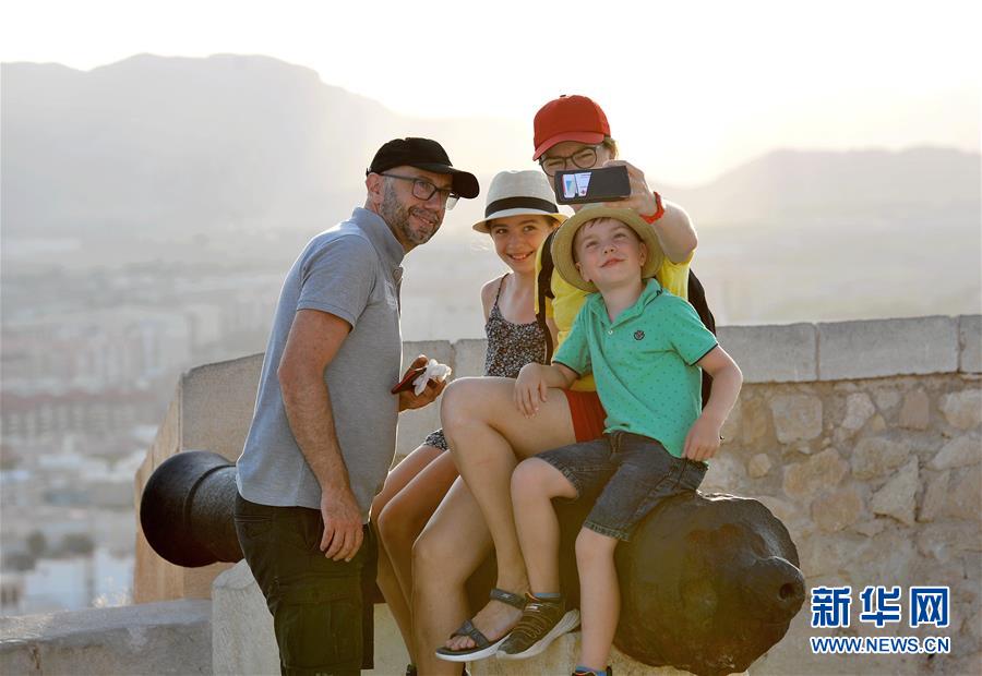 7月28日,游客在西班牙阿利坎特市的圣巴巴拉城堡上自拍。 盛夏时节,西班牙内陆地区持续高温,沿海地区成为人们消暑度假的首选,迎来大批游客。 新华社记者 郭求达 摄