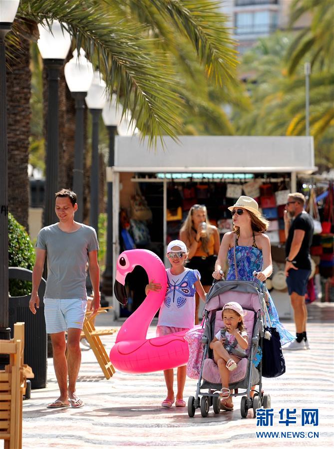 7月28日,人们行走在西班牙阿利坎特市海边的一条街道上。 盛夏时节,西班牙内陆地区持续高温,沿海地区成为人们消暑度假的首选,迎来大批游客。 新华社记者 郭求达 摄