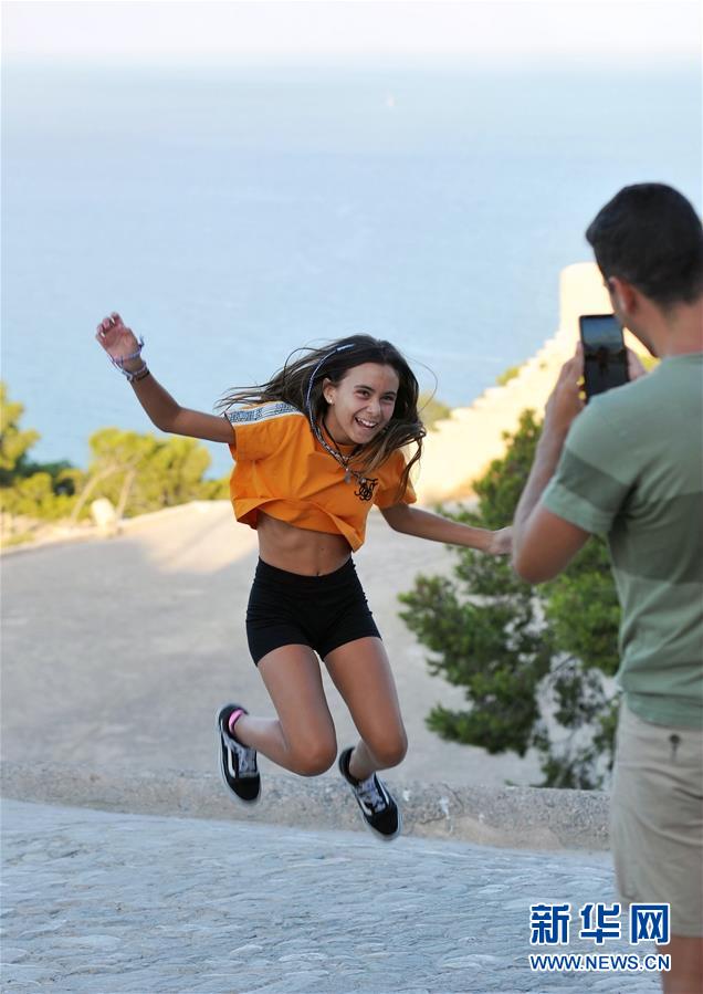 7月28日,一名女孩在西班牙阿利坎特市的圣巴巴拉城堡上拍照。 盛夏时节,西班牙内陆地区持续高温,沿海地区成为人们消暑度假的首选,迎来大批游客。 新华社记者 郭求达 摄