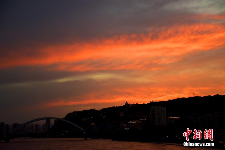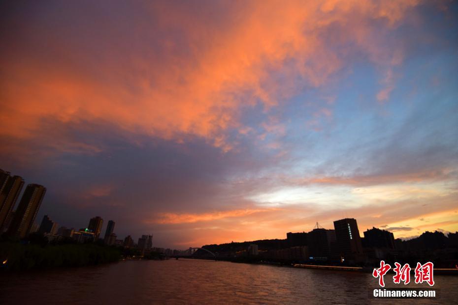 7月31日,甘肃兰州一场骤雨过后,绚丽的晚霞出现在天际,映照在黄河水面上,呈现出水天一色的壮美景观。图为雨后的兰州。韦德占 摄
