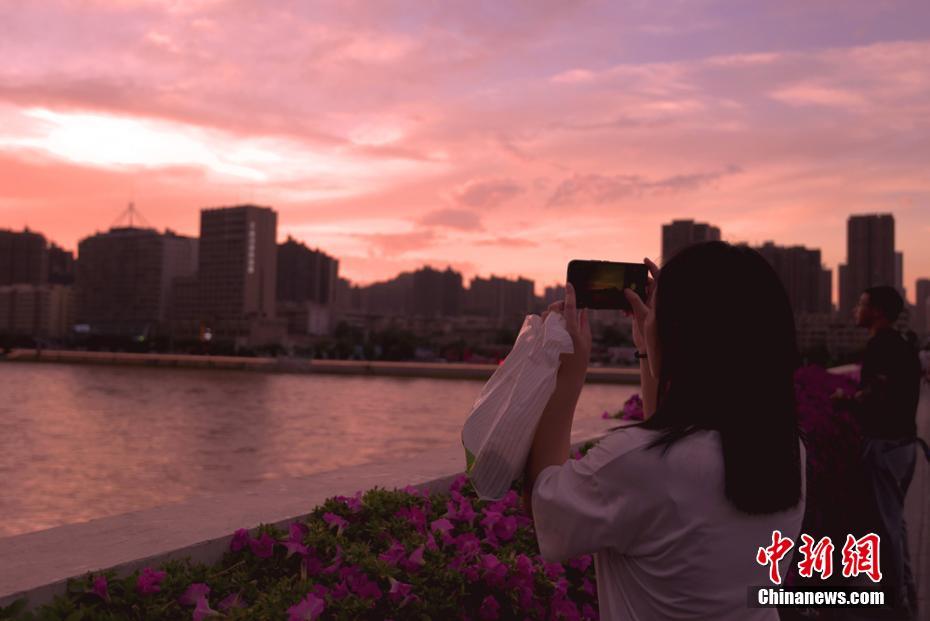 7月31日,甘肃兰州一场骤雨过后,绚丽的晚霞出现在天际,映照在黄河水面上,呈现出水天一色的壮美景观。图为民众驻足观赏拍照。韦德占 摄