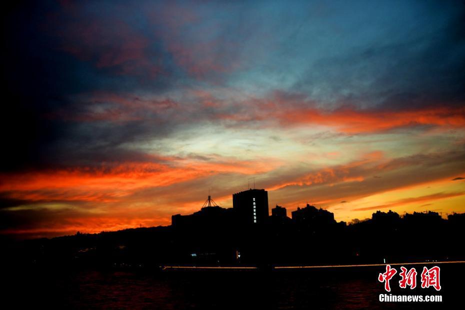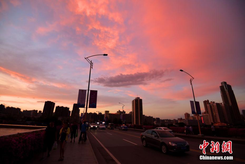 7月31日,甘肃兰州一场骤雨过后,绚丽的晚霞出现在天际,映照在黄河水面上,呈现出水天一色的壮美景观。图为天边晚霞色彩斑斓。韦德占 摄