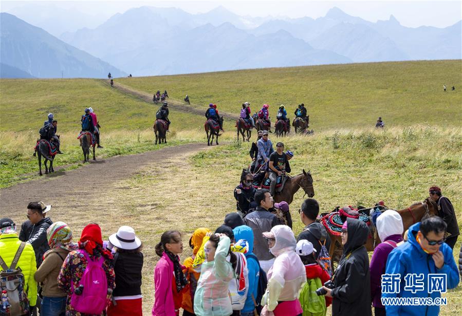 8月14日,游客在喀拉峻草原上体验骑马。 喀拉峻草原位于新疆伊犁河谷的特克斯县境内,山峦连绵起伏,线条柔美,层次分明,犹如一幅大气磅礴的天然画卷。 新华社记者 胡虎虎 摄