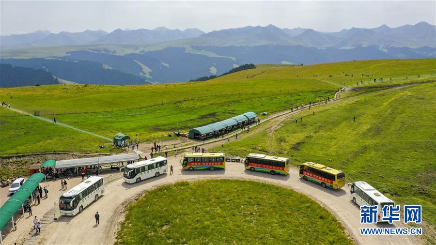 8月14日,游客在喀拉峻草原上游玩(无人机拍摄)。 喀拉峻草原位于新疆伊犁河谷的特克斯县境内,山峦连绵起伏,线条柔美,层次分明,犹如一幅大气磅礴的天然画卷。 新华社记者 胡虎虎 摄