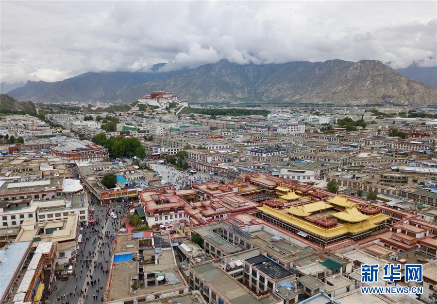 8月10日无人机拍摄的大昭寺和远处的布达拉宫。新华社记者 侯东涛 摄