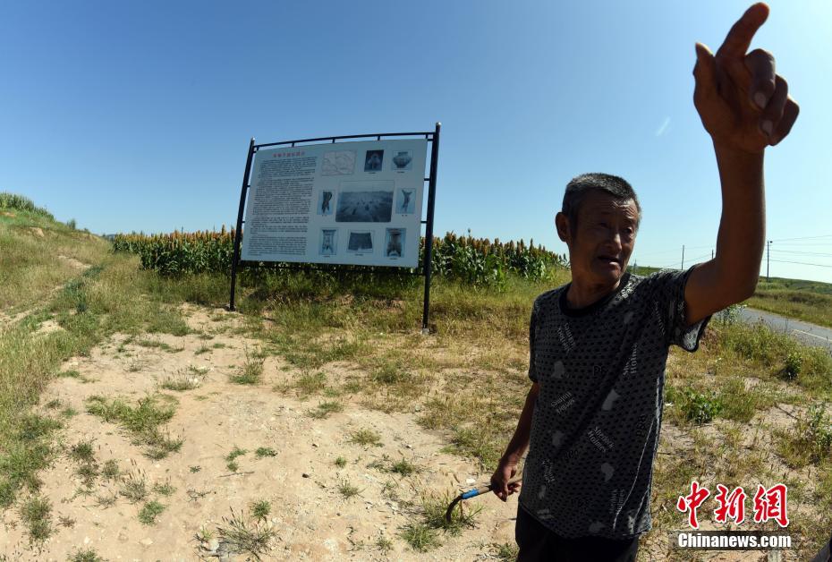 9月2日,看护大甸子遗址的村民介绍遗址保护相关情况。位于内蒙古自治区赤峰市敖汉旗的青铜时代遗址——大甸子夏家店下层文化遗址发现于1973年,后由中国社会科学院考古研究所进行部分墓葬发掘,出土大批精美陶器、青铜器和玉器。据了解,考古工作者目前已规划在农作物收割后,对该遗址的城址及居住区等进行发掘研究。中新社记者 孙自法 摄