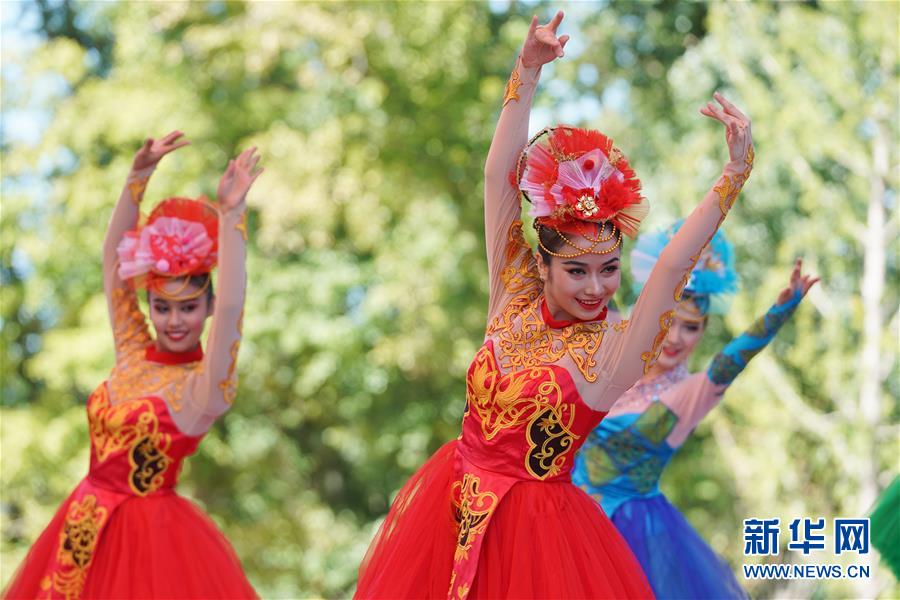 9月16日,演员在“新疆日”活动上表演舞蹈《石榴花开》。 当日,2019年中国北京世界园艺博览会“新疆日”活动在北京世园会园区举行。 新华社记者鞠焕宗摄