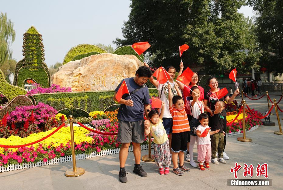 10月2日,国庆假期第二天,北京玉渊潭公园为庆祝新中国成立70周年华诞,开展“文明实践新风尚——心语颂祖国”主题活动。志愿者向参与活动的游客讲解国庆节、国旗、国徽、国歌的知识,带领大家唱响祖国、守护国旗、致敬国徽。图为游客在主题花坛前合影。中新社记者 杜洋 摄