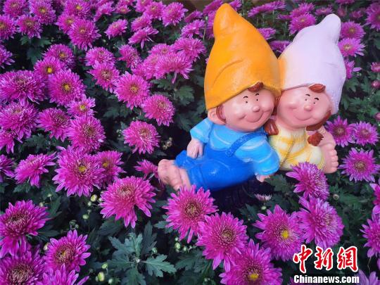 一对玩偶坐在菊花丛中憨态可掬 刘鹏 摄