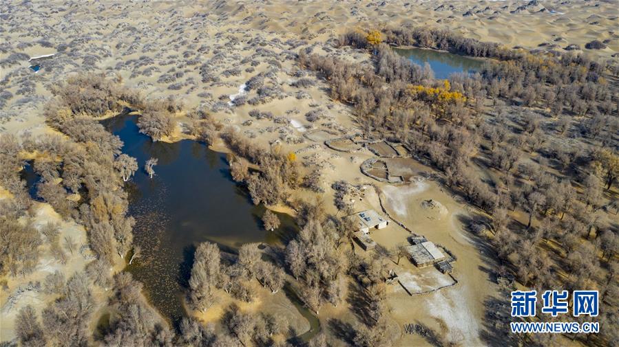 这是位于克里雅河尾闾的民居及胡杨林(11月16日无人机拍摄)。 新华社记者 胡虎虎 摄