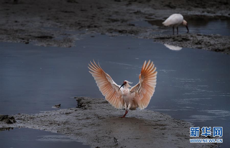 11月19日,朱鹮在汉江支流的牧马河畔觅食。 每年冬季,成群结队的朱鹮飞翔在汉江及汉江支流的河滩、湿地,觅食、栖息,成为当地一道亮丽的风景线。 新华社记者陶明摄