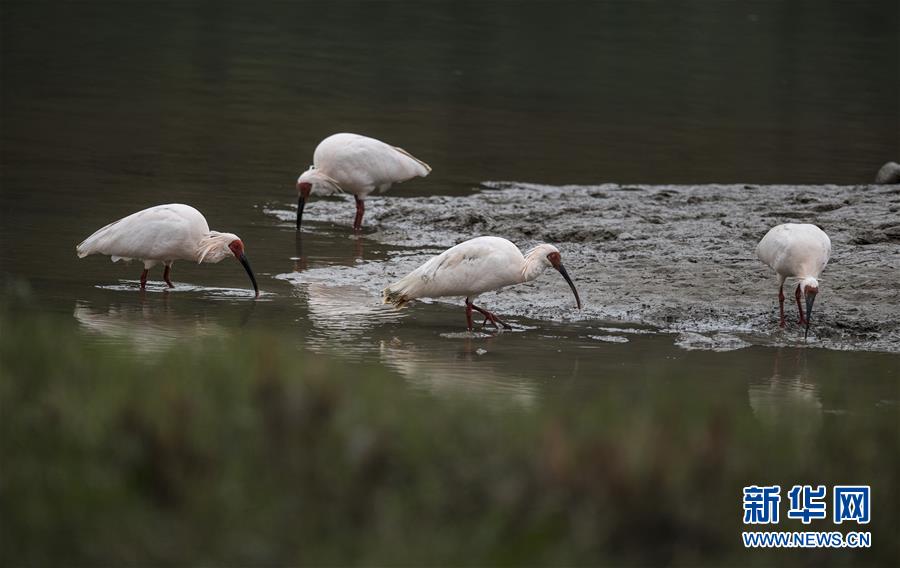 11月19日,朱鹮在陕西省汉中市西乡县峡口镇井坝村牧马河里觅食。 每年冬季,成群结队的朱鹮飞翔在汉江及汉江支流的河滩、湿地,觅食、栖息,成为当地一道亮丽的风景线。 新华社记者陶明摄