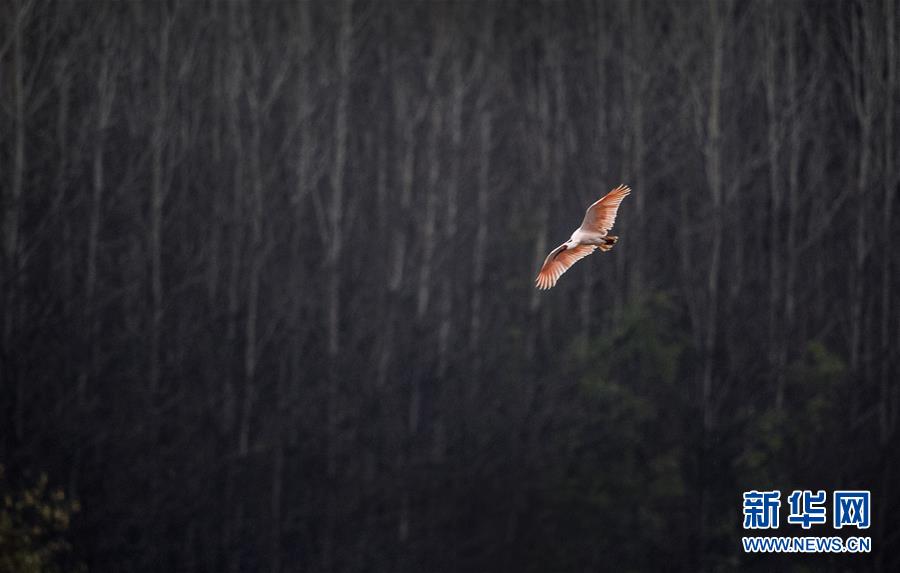 11月19日,朱鹮在汉江支流的牧马河上空翱翔。 每年冬季,成群结队的朱鹮飞翔在汉江及汉江支流的河滩、湿地,觅食、栖息,成为当地一道亮丽的风景线。 新华社记者陶明摄
