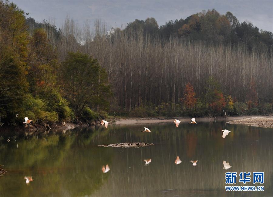 11月19日,朱鹮飞翔在陕西省汉中市西乡县峡口镇牧马河畔。 每年冬季,成群结队的朱鹮飞翔在汉江及汉江支流的河滩、湿地,觅食、栖息,成为当地一道亮丽的风景线。 新华社记者陶明摄