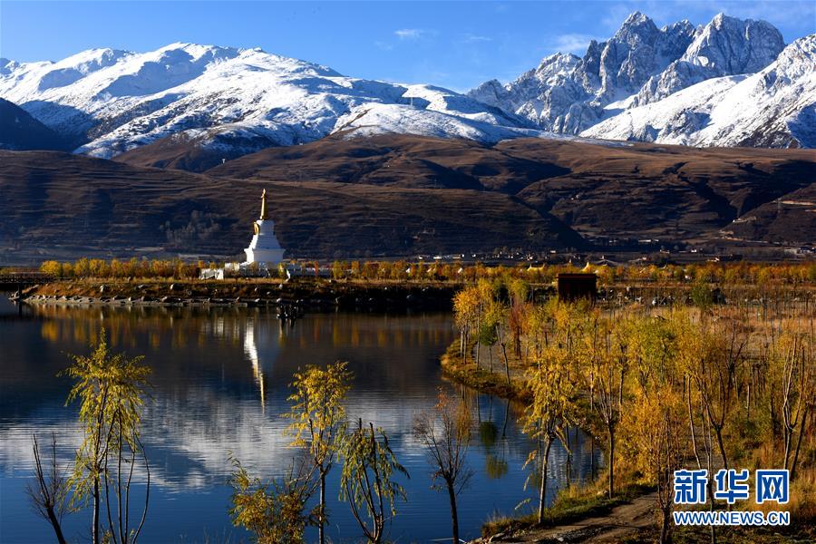 川藏线四川甘孜县境内的雪山、白塔和民居(11月3日摄)。新华社记者 陈天湖 摄