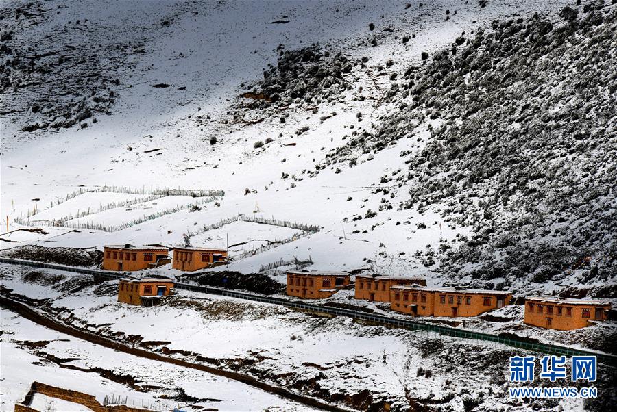 川藏线四川理塘县境内的雪山和民居(10月17日摄)。新华社记者 陈天湖 摄