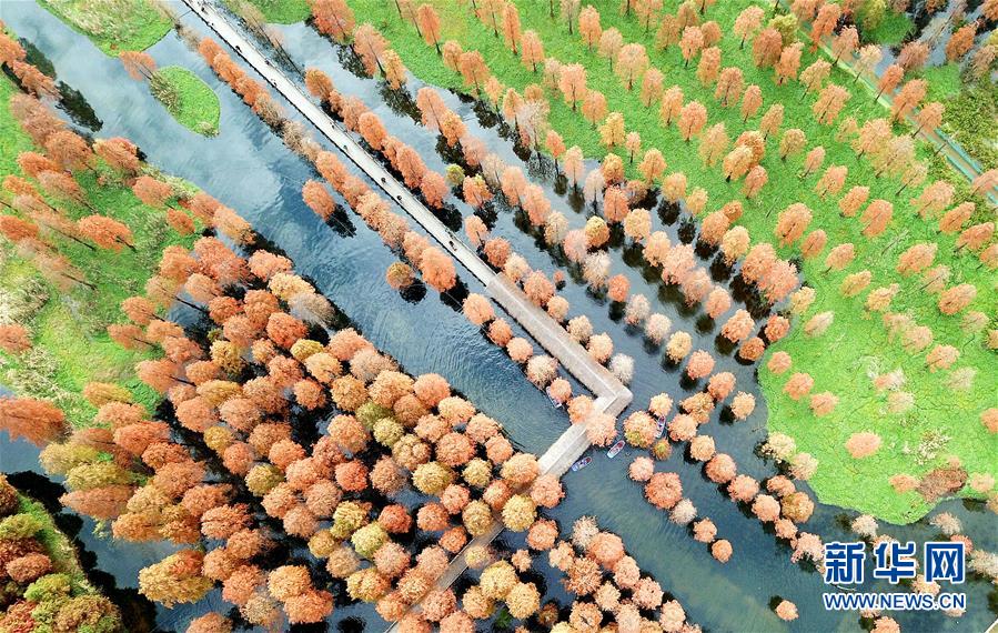 12月5日无人机拍摄的青西郊野公园的水杉树。 位于上海青浦区金泽镇的青西郊野公园是一个以湿地为特色的郊野公园,园内的水杉林在初冬时节披上红色外衣,美不胜收。 新华社记者 方喆 摄