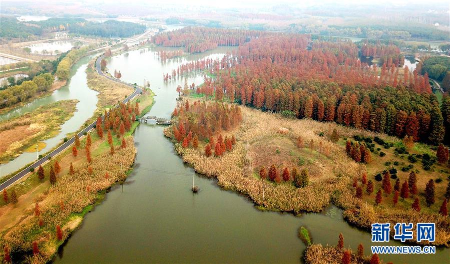 12月5日无人机拍摄的青西郊野公园的水杉树。 位于上海青浦区金泽镇的青西郊野公园是一个以湿地为特色的郊野公园,园内的水杉林在初冬时节披上红色外衣,美不胜收。 新华社记者 方喆 摄