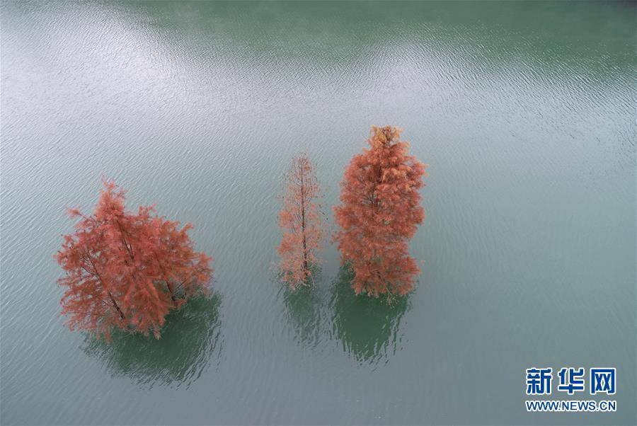 瀛湖水杉景色(12月5日无人机拍摄)。 冬日清晨,我国南水北调中线工程的重要水源地——位于陕西安康市汉滨区境内的瀛湖呈现一派瑰丽景象。 新华社记者 邵瑞 摄