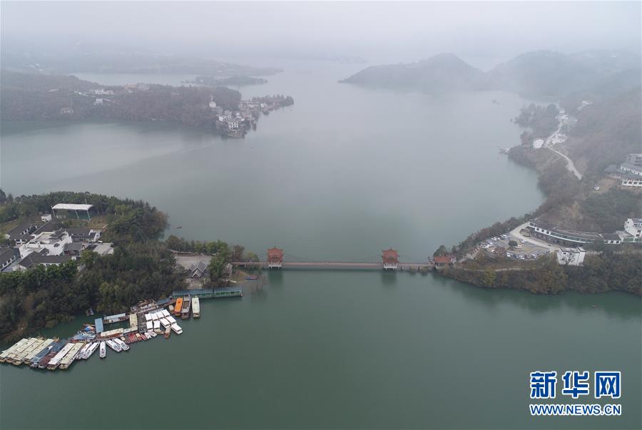 瀛湖翠屏岛风光(12月5日无人机拍摄)。 冬日清晨,我国南水北调中线工程的重要水源地——位于陕西安康市汉滨区境内的瀛湖呈现一派瑰丽景象。 新华社记者 邵瑞 摄
