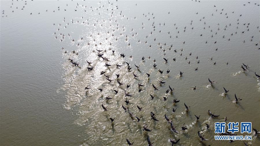 12月15日在菜子湖湿地拍摄的候鸟(无人机拍摄)。 入冬以来,大批候鸟飞抵位于安徽省安庆市的菜子湖湿地越冬。 新华社记者 张端 摄